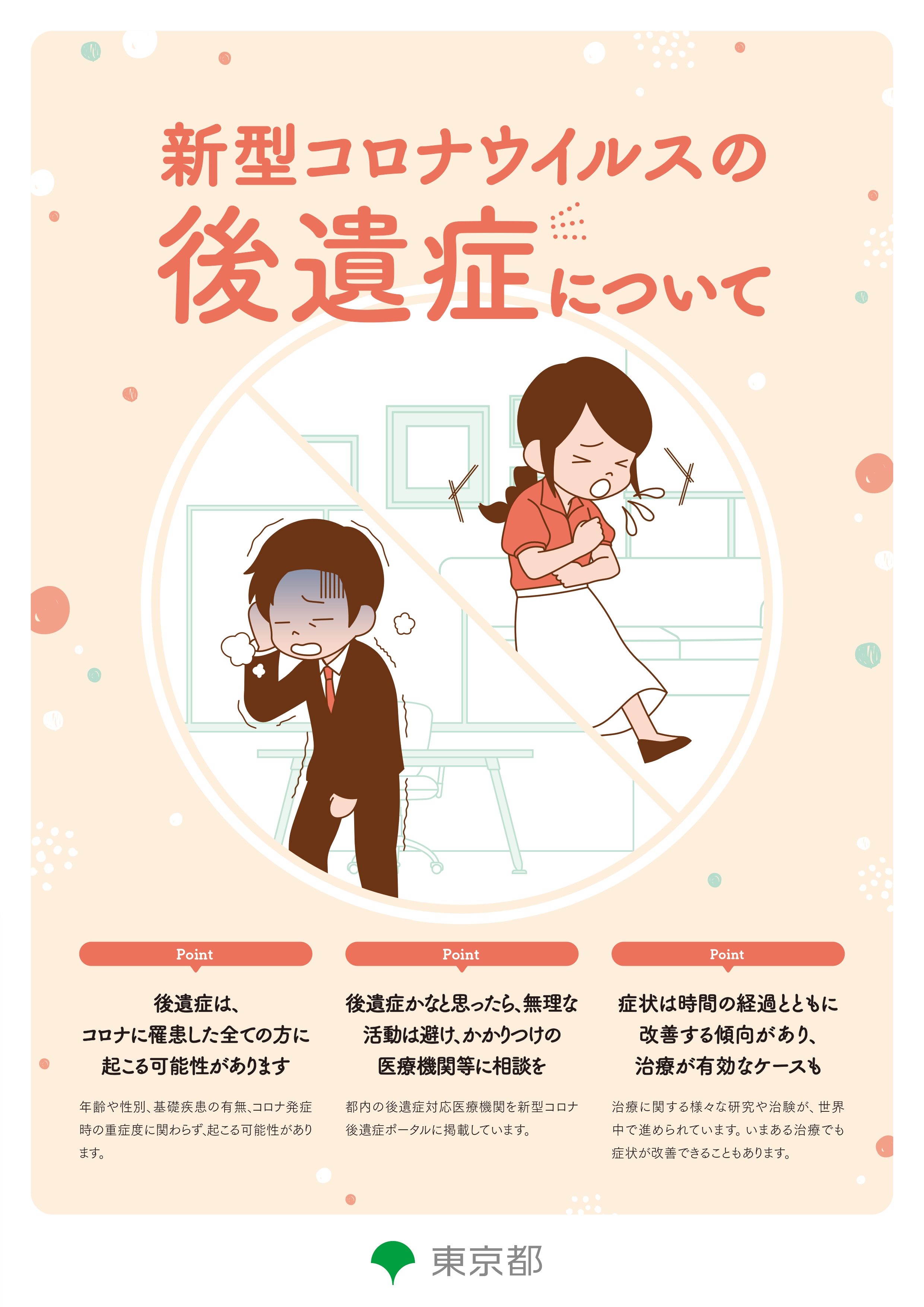 新型コロナ感染後に様々な症状で苦しむ方々や、その周囲の方々に、後遺症の可能性があることを知っていただき、医療機関受診や相談、後遺症の理解等につなげることを目的として、リーフレットを作成しました。